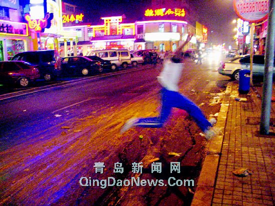 昨晚8時許,記者在臺東八路順泰酒店門前的馬路上看到,一段10米長的路灑落泔水占據了大半個路面,車輛駛過碾起黃色的泔水油,空氣中彌漫著刺鼻的酸臭味,行人紛紛掩鼻而過。據現場目擊的付女士介紹,一個小時內有8名摩托車駕駛員在此摔倒,其中一名載人的小伙子摔得很慘,不但全身沾滿了惡臭的泔水,身上還多處受傷,已經到醫院治療。有好心的市民已在此設置了警示。