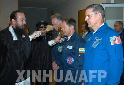 9月30日,在哈薩克斯坦的拜科努爾發射場,一位牧師向美國富翁奧爾森、俄羅斯宇航員托卡列夫和美國宇航員麥克阿瑟賜福。俄羅斯國家委員會30日在拜科努爾發射