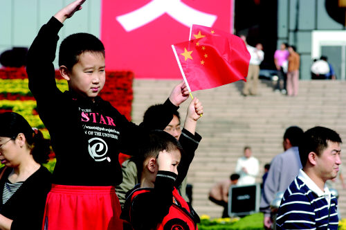 昨天清晨7時30分,離慶祝中華人民共和國成立56周年升國旗儀式開始還有1個小時,市民和游客就從四面八方聚攏到市政府前樓廣場,等待著五星紅旗迎風飄揚的那一刻。昨天 共有上萬名市民參加了升國旗儀式。    8時30分,21名國旗護衛隊隊員護送著國旗走到旗桿下,伴隨著雄壯激昂的《義勇軍進行曲》,鮮艷的五星紅旗從升旗手手中揚到空中,冉冉升起。記者于小陽攝