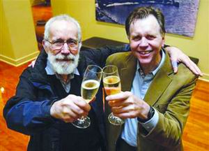 10月3日,巴里·馬歇爾(右)與羅賓·沃倫得知自己獲得2005年諾貝爾生理學(xué)或醫(yī)學(xué)獎后,舉杯互相慶賀。