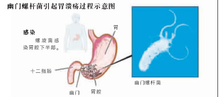 幽門螺桿菌引發(fā)胃潰瘍過程示意圖:感染
