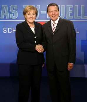 2005年9月24日,德國總理施羅德及保守派的挑戰(zhàn)者安吉拉·默克爾在柏林一家電視臺錄制間前合影。
