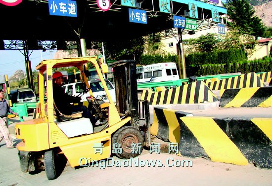 叉車正在拆除羅圈澗收費站外的通道隔離墩記者高迪攝 | 早