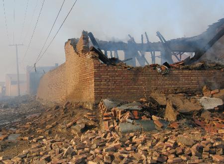 早上7時30分左右突然發生兩聲巨響,村里濃煙滾滾,約兩三分鐘后震天的炮聲響徹整個村莊,有的房子被震倒,大部分窗戶玻璃被震碎。爆炸引燃了其他村民宅院生產的爆竹及原料,到記者離開現場時,部分村民已卷起鋪蓋卷兒到村外的莊稼地里睡覺,消防人員正在進行又一輪的滅火。