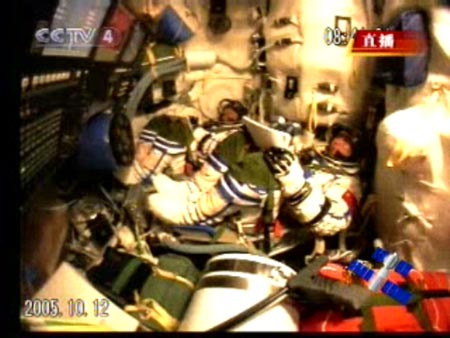 兩位宇航員在飛船內 兩位宇航員進入飛船,準備發射。圖為宇航員在飛船內電視截圖