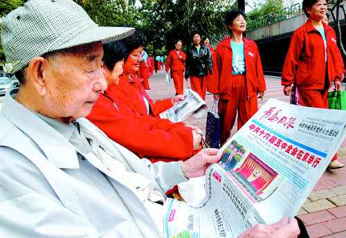 昨天一大早,在老舍公園晨練的老人便從附近的報(bào)攤上購(gòu)買了《青島日?qǐng)?bào)》,認(rèn)真閱讀有關(guān)中共十六屆五中全會(huì)的報(bào)道。李學(xué)亮攝