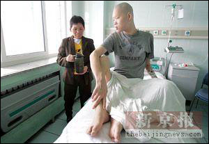 去年12月劉麗突然失明并昏迷,被送往醫(yī)院。今年9月23日她來北京做手術。原來體重126公斤的劉麗一下瘦了40斤,3個月沒下床了,小腿肌肉開始萎縮,膝關節(jié)顯得額外粗大。