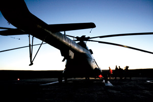 昨日,內蒙古四子王旗空中搜救分隊的直升機準備夜航。 新華社記者 王建民 攝