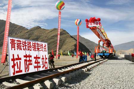 今天當十幾萬青藏鐵路的建設者在拉薩市火車站鋪下最后一節鋼軌時,唐古拉山口呼嘯的狂風和無情肆虐的冰雪,再也止不住他們盈眶的熱淚,在全國人民的問候祝福的歡歌笑語中,偉大的建設者向全世界展示了他們挑戰極限,征服自然的永久意義。(