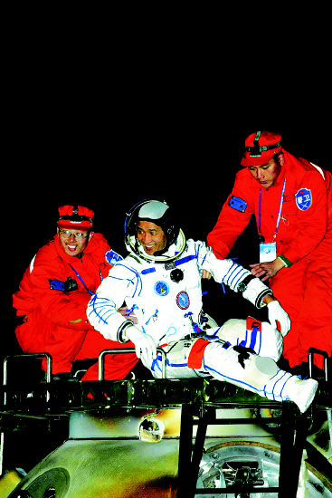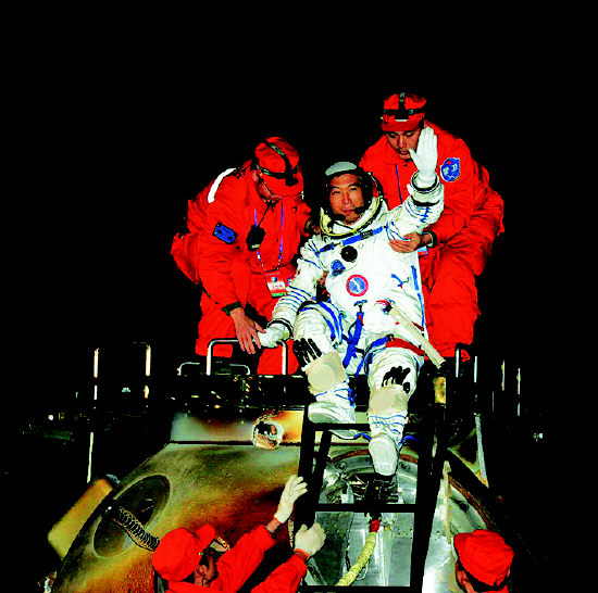 航天員費(fèi)俊龍走出返回艙。航天員聶海勝出艙。    中共中央國務(wù)院中央軍委致電祝賀    吳邦國賈慶林黃菊吳官正觀看飛船返回實(shí)況吳邦國宣讀賀電    今晨4時33分,神舟六號返回艙在內(nèi)蒙古四子王旗中部草原成功著陸,航天員費(fèi)俊    龍、聶海勝平安返回。這是北京航天飛行控制中心的工作人員在歡慶。新華社發(fā)