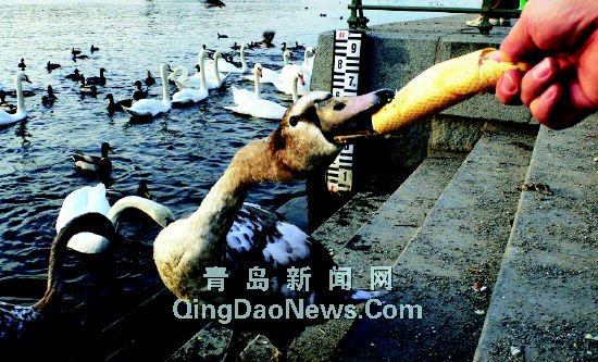 10月19日,在捷克首都布拉格市中心的伏爾塔瓦河畔,一名路人為城市天鵝喂食 |