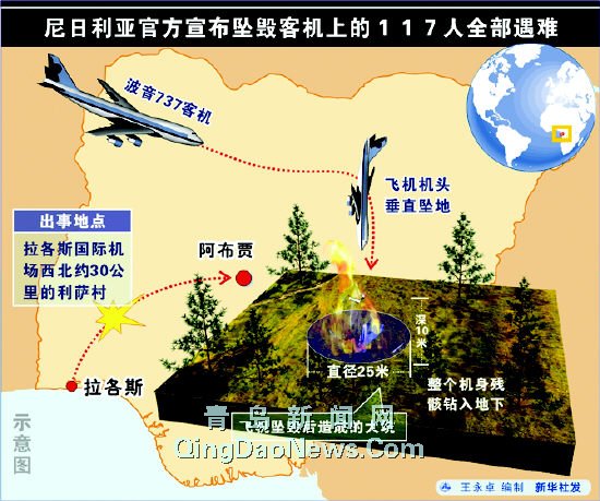 扭曲的金屬,破損的行李,殘缺的肢體。在經歷了一系列混亂與謠言之后,尼日利亞貝爾菲尤航空公司一架失事波音737客機的殘骸23日終于被找到。當局說,從現場情況看,機上的117人已經全部遇難。    現場沒有發現任何幸存者