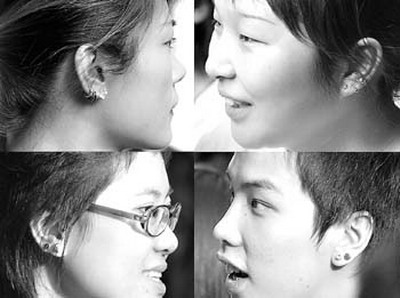 很快,小湘發現耳朵穿四孔實在不出奇,她身邊的很多朋友,單一只耳朵就有扎五六個孔的,耳垂沒有地方了,她就在耳廓上找地方扎,“耳廓面積小,扎孔疼,但是只要能出風頭,一點點疼痛忍忍就過去了”。現在她的左耳上共扎了9個孔,平時通常都只戴五六只耳環上去,只有參加“哈韓族”聚會或者出入大的社交活動時,她會翻騰出自己所有的飾物,戴滿9個耳洞。奇怪的是,小湘只在右耳鉆了5個孔,按照她的審美規則,不均衡、不對稱才是美,是一種另類的美。這樣一年時間里,少女總共挨了14“槍”,在兩耳上穿了數量不等的14個孔。