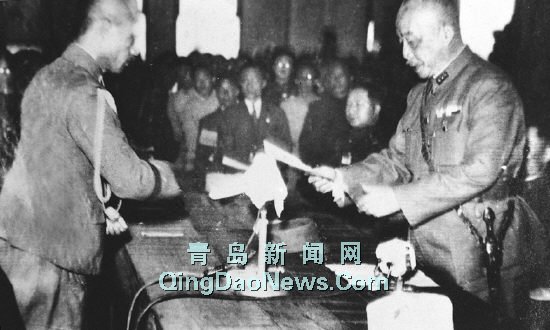 1945年10月25日,中國戰(zhàn)區(qū)臺灣省受降儀式在臺北市中山堂舉行,臺灣及澎湖列島正式重歸中國版圖。這是1945年10月25日,侵華日軍投降代表安藤利吉在儀式上將投降書呈送給中國受降主官陳儀將軍(右)。新華社發(fā)