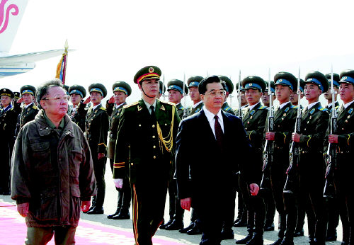 機場上舉行了隆重的歡迎儀式。軍樂隊奏兩國國歌,在21響禮炮聲中,胡錦濤在金正日陪同下檢閱了朝鮮人民軍三軍儀仗隊。胡錦濤還同前來歡迎的其他朝鮮黨政軍領導人親切握手見面。