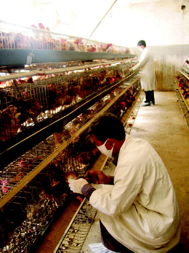 即墨一養雞場內,畜牧部門的工作人員正在給雞注射疫苗 |