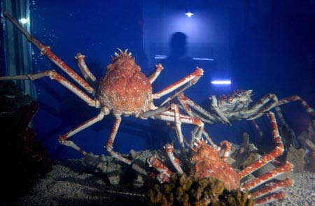記者在現場看見,它們看起來就像巨大的毒蜘蛛,寬30多厘米,當它伸開8支鋒利的蟹爪時,足有3米多長。在玻璃展廳內,3只殺人蟹悠閑地浮在水面上。但當工作人員放進一批鯉魚后,它們立刻行動起來,一下子站立起來,頓時“長”到半人高,而靈敏的蟹爪早已經抓住鯉魚,往嘴里送去。動作非常迅速,雖然隔著玻璃,仍然讓人感覺到“殺氣陣陣”。