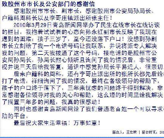 王女士在青島新聞網發出的感謝信 ??? 記者采訪了解到,像王女士這樣的情況并非個例,許多村莊都有這方面的“土規定”:女性青年出嫁后不再享受村里待遇,孩子也不能隨母親落戶,要落戶必須交3000-5000元的“保證金”。膠州市副市長孫永紅做客“民生在線”后,一系列類似問題迅速得到解決,政府有關部門的辦事效率受到了網友的稱贊。(記者 任俊峰) |