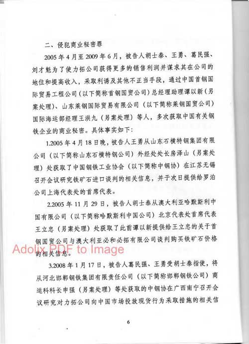 ????此前媒體曾報道,有20家中國鋼廠和貿易商向力拓涉案員工行賄,泄密人員為首鋼員工譚以新和萊鋼員工王洪九。但從判決書內容看,涉及泄露中國鋼企商業機密的還有山東石橫特鋼集團外經處處長房澤山,河北邯鄲鋼鐵集團商運科科長申強。