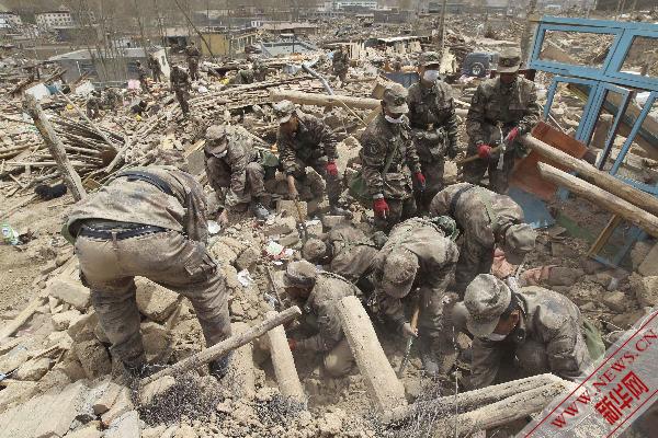 4月16日,解放軍官兵在玉樹縣結(jié)古鎮(zhèn)展開搜救工作。新華社發(fā)(劉應華 攝)