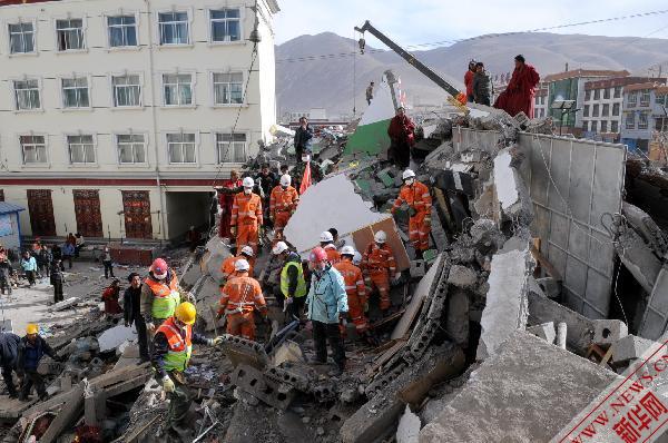 4月16日,救援人員在廢墟中尋找幸存者。當日是青海玉樹地震后的第三天,來自全國各地的搜救隊伍依然在廢墟中積極尋找幸存者。新華社記者 吳光于 攝
