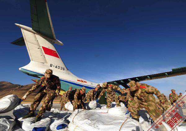 4月17日,在青海玉樹機場,空軍官兵從運輸機上卸下抗震救災物資。新華社發(沈玲 攝)