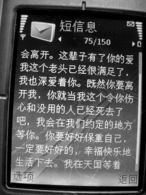 ????3月7日上午開始,大量的短信談到了雙方的“約定”——一起去“天國”。3月7日上午10點41分的一則短信說:“親愛的,我好痛心,好失望……事情沒有我想象的那樣,沒有誰的婚可以離得那么順利。……我會在我們約定的地方等你。……我在天國等著你。我愛你!永遠的愛你!!”而在于丹丹發給陳偉忠的短信中,也出現了這樣的語句:“給我打過來,我真的想好好聽聽你的聲音,這樣我也會安心地走,好嗎?”陳偉忠涉及到自殺內容的短信還有:10時52分發的“……永別了我最愛的人!我愛你!”12時17分發的“……我會靜靜的(地)消失,只帶著太多的遺憾走了,親愛的,我愛你!你要好好的保重!你給我的東西我一定帶著一起走。”13時06分:“親愛的寶貝,我們永別了!不會給你添麻煩了。”13時13分:“謝謝你給我的一切,我永生不忘,謝謝!”最后一條短信發自15時11分:“我走了,你讓我痛苦一輩子吧。”