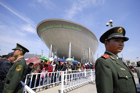 上海世博會昨平穩通過40萬人“壓力大測試”。圖為沙特阿拉伯館外游客有序排隊。
