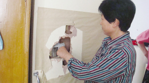張女士演示去年敲門時把門板敲穿的場景。宋南飛攝(圖片來源:揚子晚報)