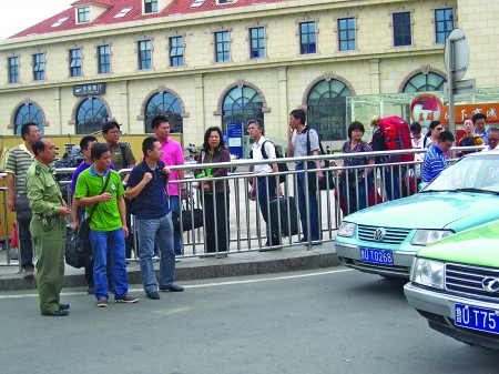 ????當北京至青島動車上的乘客下車后,工作人員一邊引導乘客排隊候車(如圖),一邊引導出租車上前拉客。15分鐘后,現場的乘客基本分流完畢,泰安路上也沒有造成擁堵。但是記者也注意到,泰安路上還有出租車司機大聲招呼乘客,一名出租車司機跟三名去李滄的乘客商定不打表每人35元錢之后,還提出要再拼一個人上車才走。