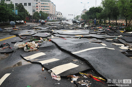 6月21日早上,江西余江縣城洪水退去,城區路面被洪水泡過后變成碎片。