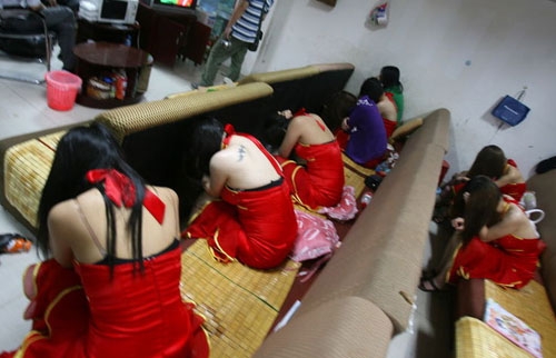 6月22日晚,南寧市公安局統一部署,對該市四個城區的游戲機賭博窩點及涉黃場所進行查處行動。在南寧仙葫大道18號金富盈大酒店的休閑會所內,10多名穿著暴露的女子坐在沙發上,逐個接受民警的檢查。