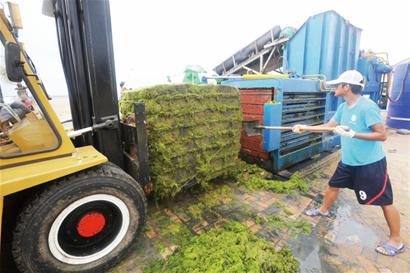 ????記者在八大峽滸苔處置現場看到,鏟車將滸苔投放到滸苔脫水打包機的上料漏斗里,再通過傳送帶,將這些滸苔送入加壓艙,在機械擠壓的作用下,海水從機械預留的縫隙中濺到地面,順著設置在機械旁的專用下水道重歸大海,而滸苔則慢慢地被壓實、壓干,20分鐘左右,一個方方正正的滸苔包就制成了。