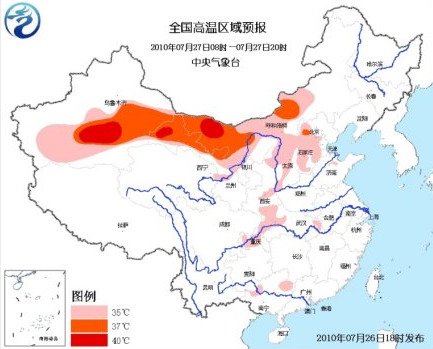 ????中央氣象臺26日繼續發布高溫藍色預警。預計,26日,北京大部、天津西部、河北中西部、陜西東北部和關中地區、山西北部、重慶中西部、湖南大部、湖北東南部、江西西北部、廣西東北部、廣東西部和東北部等地仍有35℃以上的高溫天氣,局地最高氣溫可達37~38℃;內蒙古中西部、甘肅中西部、新疆吐魯番盆地及南疆盆地大部等地將有35~37℃的高溫天氣,局部地區最高氣溫可達42℃以上。