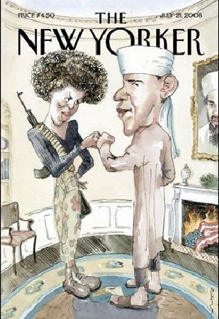 美國民主黨總統候選人奧巴馬和他的夫人出現在2008年7月份的 《紐約客》雜志封面上,兩人被描畫成“恐怖份子”的模樣,漫畫上的奧巴馬趿拉著鞋,身穿穆斯林長袍,頭戴頭巾,奧巴馬夫人身背AK-47,美國國旗被焚燒在壁爐里,夫妻二人趾高氣揚地站在白宮橢圓辦公室,壁爐架上還掛著本·拉登的肖像。此舉遭到奧巴馬競選團隊的譴責,同時還在互聯網上引發熱議。