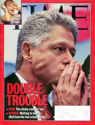 比爾·克林頓能被《時代周刊》雜志評選為“年度人物”自然是幸事。不過比爾·克林頓出現在1998年3月份的雜志封面上,頭上卻多了兩個“獸角”(字母M),不禁讓人產生聯想。