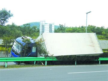 ????昨日9時許,記者途經青銀高速時,看到在青銀高速青島方向離出站口一百米處,一輛廂式貨車砸倒了9段綠色護欄,7根藍色立柱和一排小松樹。據公路交通執勤人員李先生和清障人員介紹,此次事故是由于車底傳動軸突然斷裂,導致側翻,左前輪胎附近受損較嚴重,并非人為因素造成,當時車內只有司機和副駕駛兩人。 “我們都好好的,沒受傷。 ”兩名當事人告訴記者。“司機正在聯系客戶,因為已經過去三個小時了,豬肉都已化凍,目前還不能確定客戶是否退貨,需要先找冰凍車將車廂內的貨物運走,然后才能拖車。 ”李先生告訴記者。(見習記者 張譯心 攝影報道)