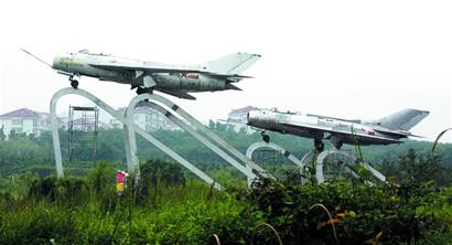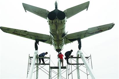 ????昨日上午10時許,經過施工人員的努力,兩架殲六飛機面向東南方“騰空而起”?!斑@兩架殲六飛機雕塑考慮到鋼結構、承重以及風速等各方面的要求,能抗12級大風?!爆F場施工負責人告訴記者,殲六飛機機身長12米,機頭前方還有2米長的測速桿,伸展機翼9米,停放高度3.88米,裝有兩臺WP-6渦噴發動機,正常起飛重量為7.4噸,拆除部分裝備后的重量也有5噸,因此對設計及吊裝過程都有很高的要求。