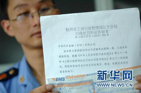 9月21日,杭州市江干區(qū)工商局執(zhí)法人員展示向豐田汽車金融(中國)有限公司發(fā)出的行政處罰聽證告知書。