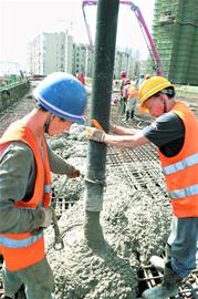 ????云南路主線高架共有6聯(lián)主橋。昨天開始澆筑的是云南路主線高架1號(hào)橋,也是最緊鄰快速路三期的一聯(lián)橋。記者上午11點(diǎn)趕到作業(yè)現(xiàn)場(chǎng),工人們正在進(jìn)行第3層混凝土澆筑。4名工人引導(dǎo)兩臺(tái)泵車通過導(dǎo)管向箱梁澆筑混凝土,流出的混凝土被工人迅速導(dǎo)入箱梁中,隨后再被振搗機(jī)均勻下引,確保澆筑的密實(shí)度。據(jù)項(xiàng)目相關(guān)負(fù)責(zé)人介紹,整個(gè)澆筑作業(yè)分6層進(jìn)行,每層澆筑混凝土30-40厘米,24小時(shí)將澆筑混凝土1280立方米。作業(yè)完成后,箱梁厚度將達(dá)到2米。