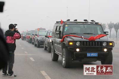 ????昨日8時30分許,石家莊火車站南廣場,悍馬、路虎、卡宴、寶馬等豪車依次排開,停在路邊的停車帶上。這些車中除了部分本地牌照外,還有些是京津等地的牌照。“這是誰家娶媳婦呢?好大的排場!”不少路人好奇地圍著看。