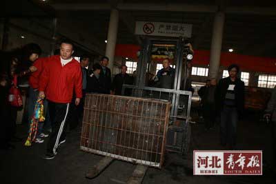 ????9時許,火車站行李房的提貨口聚滿了人。一輛叉車從庫房內緩緩駛出,只見一只黑色長毛的獅面藏獒,臥在籠中被運送了出來。