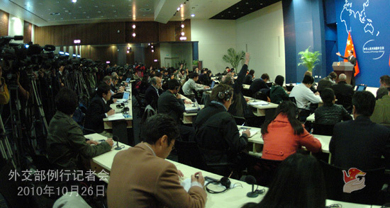 2010年10月26日,外交部發言人馬朝旭主持例行記者會。