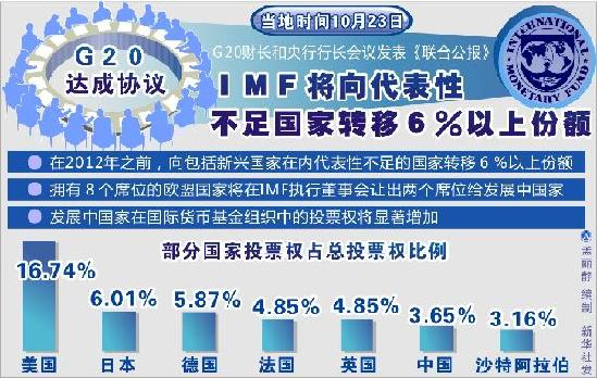 ????上月在韓國慶州召開的二十國集團財長和央行行長會議就國際貨幣基金組織份額改革達成“歷史性協議”。IMF將在2012年之前向包括新興國家在內代表性不足的國家轉移超過6%的份額。