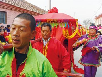 ????“太稀罕了,新郎坐著花轎接新娘?!弊蛱焐衔纾蕉仁欣顖@街道辦事處李家市村的王先生向記者報料。對于這種用花轎接新娘的低碳婚禮,很受當地村民稱道。