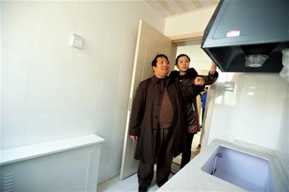 ????47歲的項本勝和妻子走進9號樓一套三居室戶型,近50平方米的房間已經(jīng)完成精裝修,廚房、衛(wèi)生間地面和墻上都鋪好了瓷磚,客廳臥室地面鋪有復(fù)合地板。“這些灶具別的房子都有吧。”看到廚房中的一體櫥柜、打火灶、吸排油煙機,項本勝有點不相信廉租房會有這么齊全的設(shè)施,在得到工作人員的肯定回答后,兩口子樂得合不攏嘴。