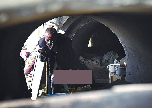 他的家由兩節水泥管組成,一節睡覺,一節放雜物。
