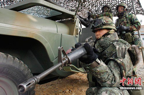 ?韓國(guó)士兵在參加登陸演習(xí)前進(jìn)行訓(xùn)練。