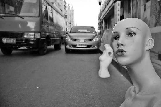 為防止私家車隨意停放,在大成路上,一服裝店老板把店內的兩個個模特架子搬到自己店鋪門前搶占車位(張曉鵬 攝)
