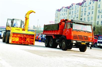 ????拋雪機和自卸車是一對好伙伴,拋雪機管收,自卸車管運。他們的關系類似聯合收割機編隊,拋雪機將路邊積雪吃下,通過傳送帶送到自卸車的后斗中,自卸車就可以將積雪運走了。